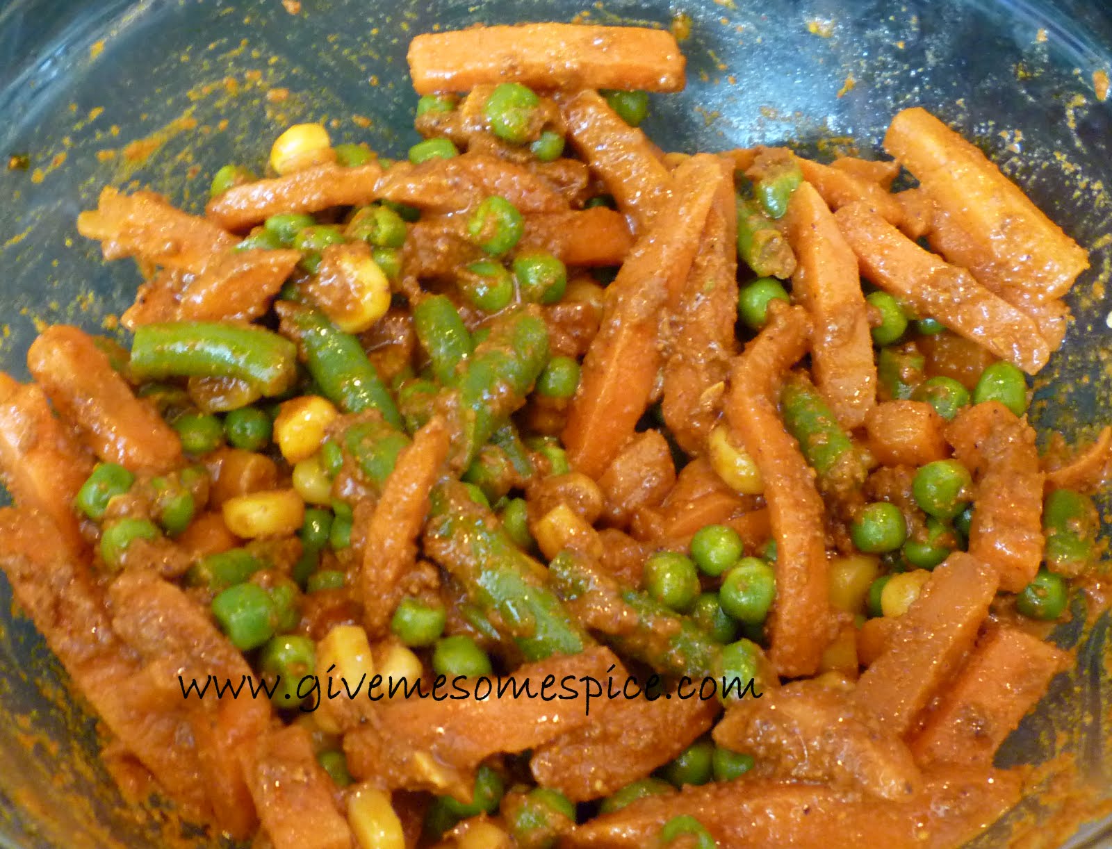 4. At the same time, use the other half of the Madras paste and marinate the vegetables for a similar time.
